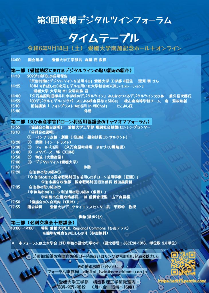 建設、ものづくり、防災、医療、農業、文化財保存等の幅広い分野・産業で注目されている「デジタルツイン」について、愛媛地区でも萌芽的な取組がなされつつあります。その現状や課題を知り、デジタルツインを発展・普及させるための連携を模索することを目的として、標記フォーラムを開催します。