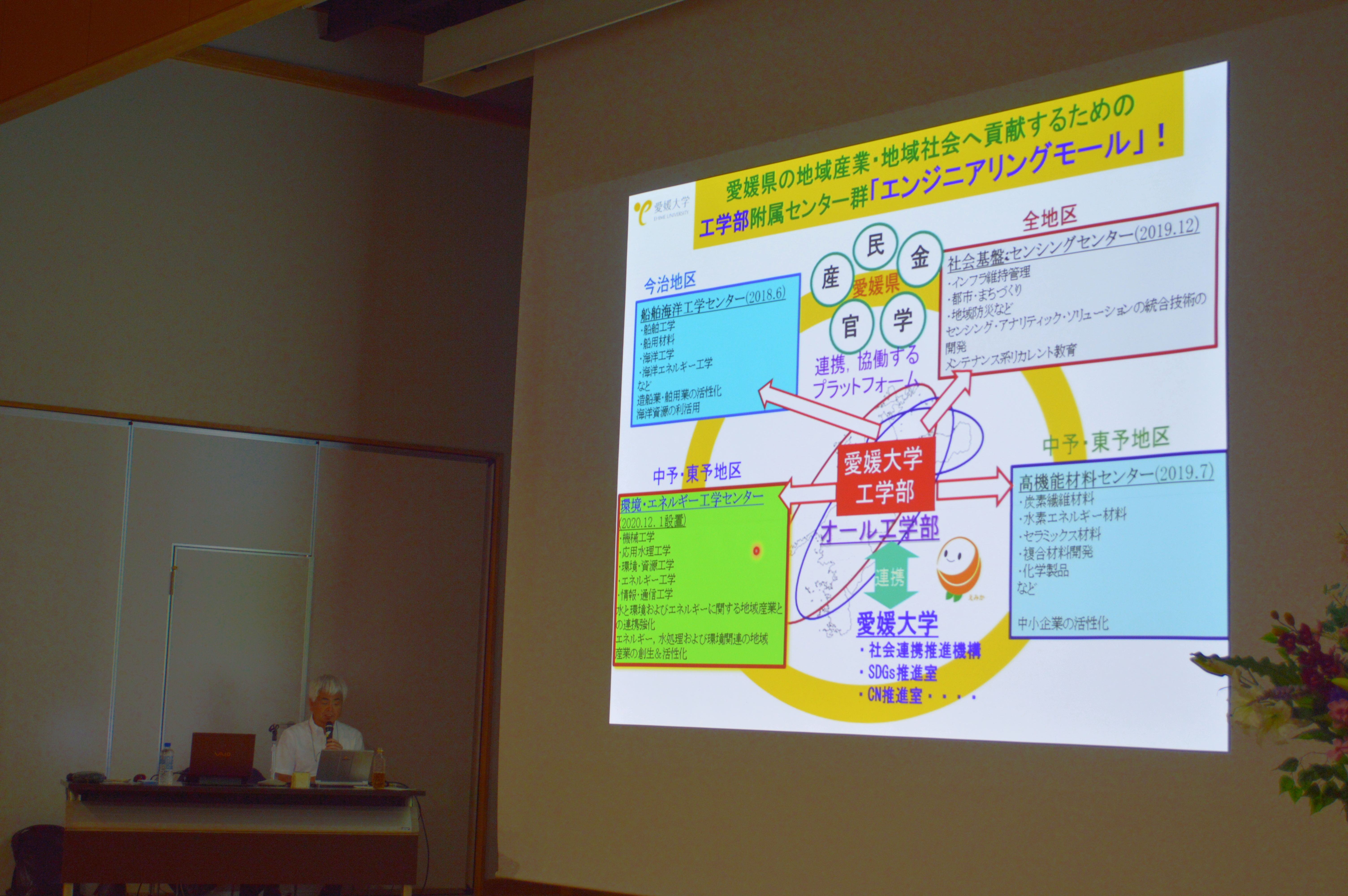 愛媛大学工学部は、愛媛県内の企業、自治体、金融機関、国の機関などとの連携を強化するため、専門分野を融合・横断したセンター群・エンジニアリングモールを組織し、地域の発展のためにオール工学部での取組を行っております。また、本学では、第4期中期目標・中期計画においては、「愛媛大学独自の中期計画に準ずる計画」を公募し、採択された計画に対して、学長戦略特別経費などで支援を行っております。この取組において、工学部から提案されたエンジニアリングモール2.0計画は、愛媛大学の地域貢献の取組として、支援を行っております。今後もこのような講演会を開催することで、参加者の方々が新たな知識を得るだけでなく、交流の場を通じてアイデアや情報を共有できるよう、より一層取り組んでまいります。