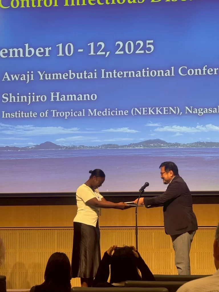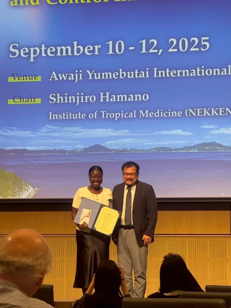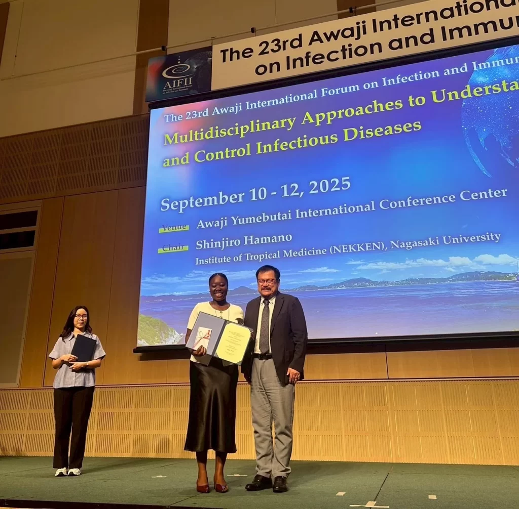 本フォーラムは令和7年9月10日(水)~12日(金)、淡路夢舞台国際会議場にて開催され、日本を代表する感染症学・免疫学の国際学会として20年以上の歴史を誇ります。最優秀ポスター発表に贈られる本賞は、参加者の投票によって決定され、今回、大学院理工学研究科博士後期課程2年(プロテオサイエンスセンター(PROS)マラリア研究部門)の Dankyi Benedicta Obenewaa(デンチ ベネディクタ オベネワー)さんを含む2名に授与されました。