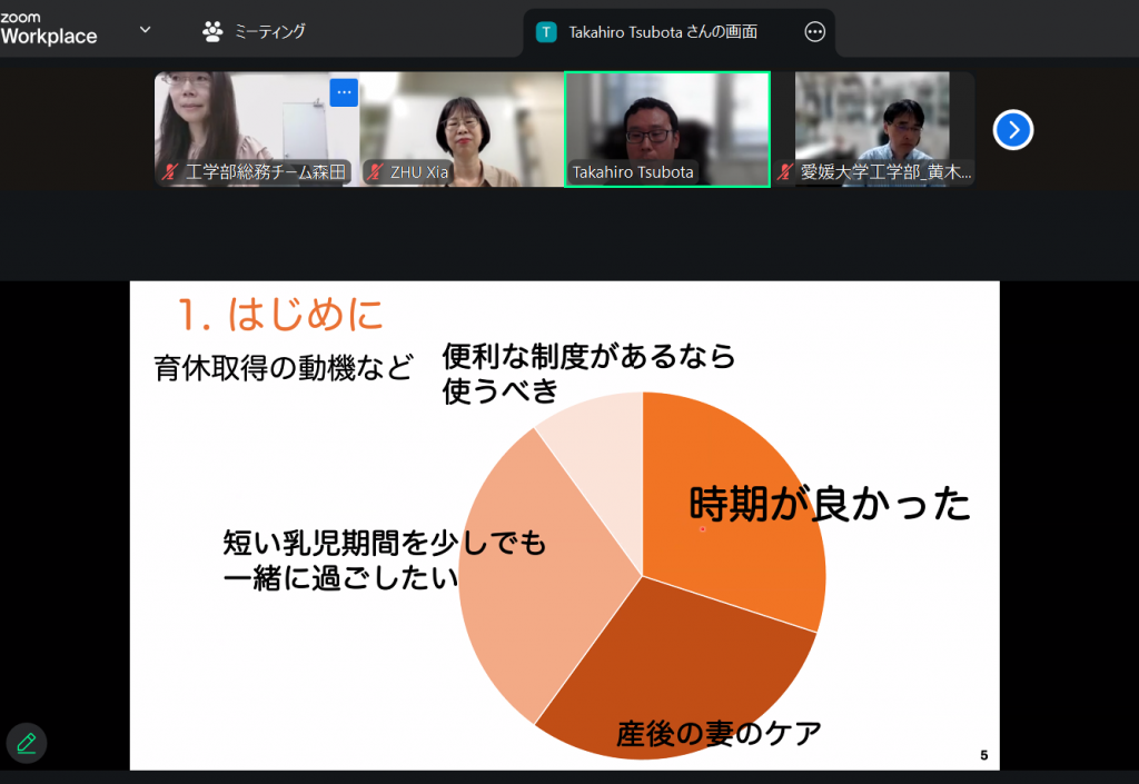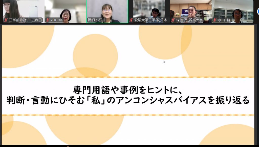 本セミナーは、工学部ダイバーシティ推進計画に基づき、毎年専門家を招いて実施しているもので、今年度は2部構成で行いました。朱霞工学部ダイバーシティ推進WG委員長による開会の挨拶に続き、前半は、坪田隆宏准教授が「産後パパ(出生時育児休業)体験」についてご自身の経験をもとに講演されました。後半では、(一社)アンコンシャスバイアス研究所認定トレーナーであり、愛媛大学ジェンダー協働推進センターライフキャリア相談室相談員の石井真奈先生をお迎えし、「性別にまつわる無意識の思い込み(アンコンシャスバイアス)への気づきを深める」と題して講演いただきました。