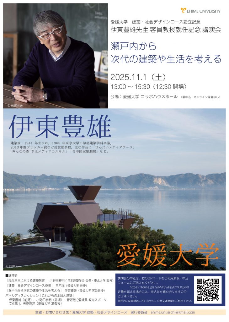 【事前要申込】愛媛大学建築・社会デザインコース設立記念伊東豊雄先生客員教授就任記念講演会を開催【11月1日(土)13:00-】