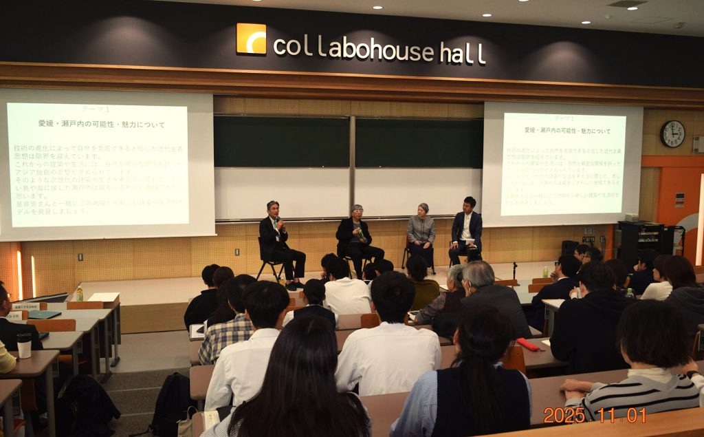 第⼆部のパネルディスカッションでは、伊東豊雄⽒、⼩野⽥泰明⽒に加えて、愛媛県観光スポーツ⽂化部⽂化局⻑の⻘野陸⽒と、建築・社会デザインコースの教員である愛媛大学大学院理工学研究科環境建設工学の⽮野寿洋准教授が登壇し、「愛媛・瀬⼾内の可能性・魅⼒について」や「愛媛⼤学の建築教育に期待すること」 について活発な意⾒交換が⾏われました。特に愛媛⼤学の建築教育への期待として、ものづくりの重要性やより良い建築をつくろうとする⾏政職員の輩出があげられました。 閉会にあたり、森脇亮⼯学部⻑から、「この講演会が、建築教育と地域の未来を結ぶ新たな出発点となることを願っています」との挨拶がありました。