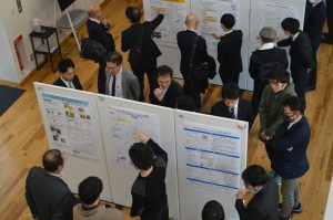 講演の終了後は、愛媛大学E.U. Regional Commons(ひめテラス)1階のNP地域交流ルームにて、愛媛大学教職員および学生によるポスターセッションを行いました。ポスターの中には新居浜工業高等専門学校より出展されたものもあり、計27件の研究発表内容をまとめたポスターが並びました。研究分野が異なる教職員・学生が一堂に会して、環境・エネルギー工学という同じテーマのもと、それぞれ異なる知見からポスターセッションをするという貴重な機会のもと、学内外問わず参加者による活発なセッションが行われました。